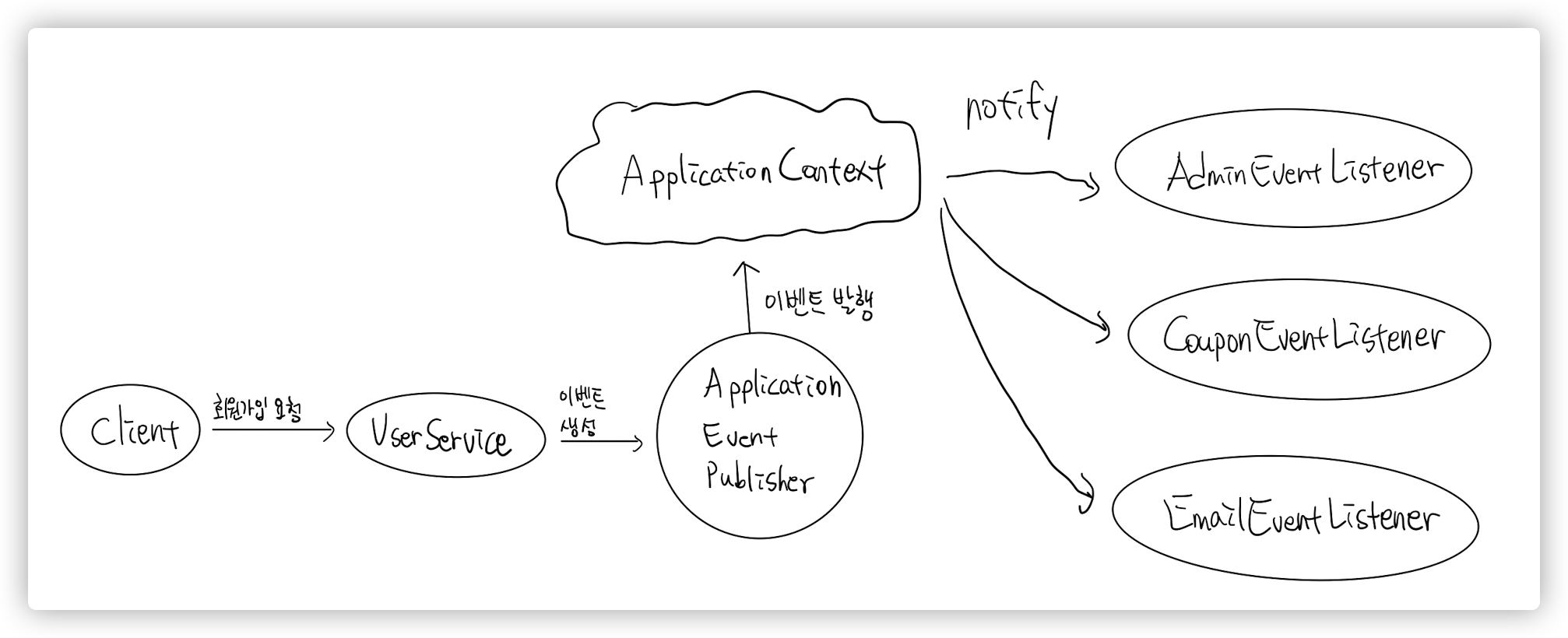 이제 UserService가 ApplicationEventPublisher에게 이벤트를 생성하여 넘겨주고 publisher가 이벤트를 발행하면 ApplicationContext가 빈으로 등록된 Listener를 notify합니다.