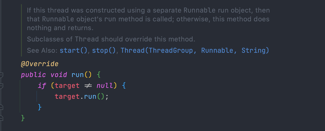 Runnable은 오로지 run() 메서드만 구현되어 있는 함수형 인터페이스이다.