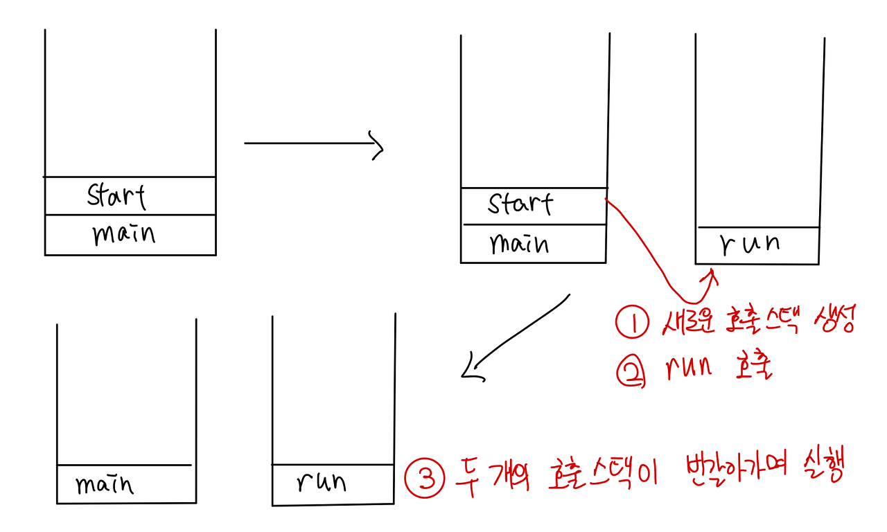쓰레드를 실행하기 위해서는 start 메서드를 통해 해당 쓰레드를 호출해야 한다. start 메서드는 쓰레드가 작업을 실행할 호출 스택을 만들고 그 안에 run 메서드를 올려주는 역할을 한다.