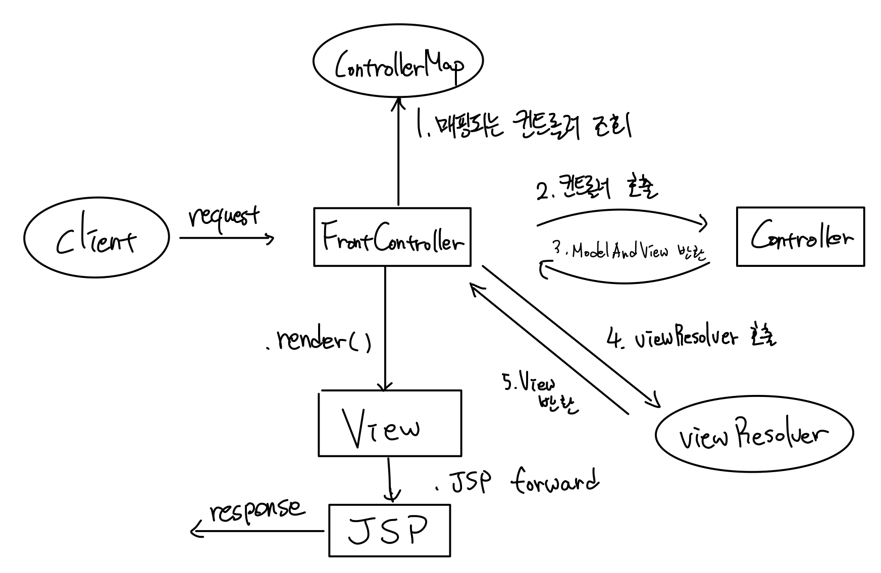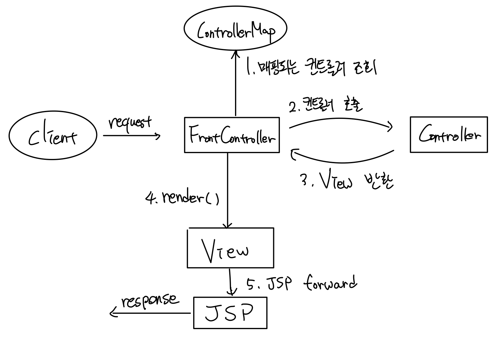 View에 전달할 정보를 담은ModelAndView라는 객체를 반환한다. - FrontController는 다시 ModelAndView에서 뷰의 논리적 이름인